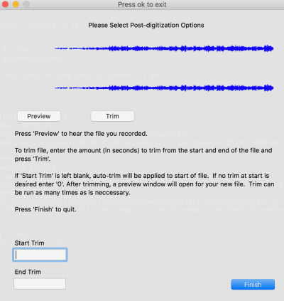 I also wanted audiorecorder to support embedding BWF metadata and to bypass any requirement for opening the file in a traditional DAW for trimming of silence. After quite a bit of experimentation, I have hit upon a series of looped functions using FFmpeg that allow for files to be manually trimmed both at the start and at the end, with the option for auto silence detect at the start. Being able to do this type of manipulation makes it possible to embed BWF metadata without worrying about having to re-embed in an edited file.
