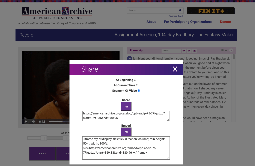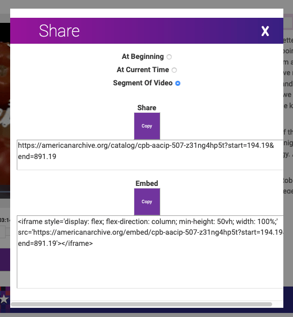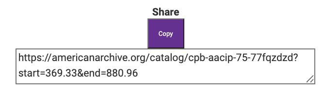 Users can share AAPB content on social media, websites, blogs, online publications, or class assignments in two ways:
