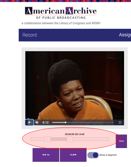 1. Visit your preferred record page and then click the ‘share’ toggle located below the audiovisual player. A timecode slider will then appear below the player. Use this slider to select a specific beginning, ending, or portion of the program you wish to share. Once you have indicated where you would like the program to begin and/ or end, press the “share” button.
