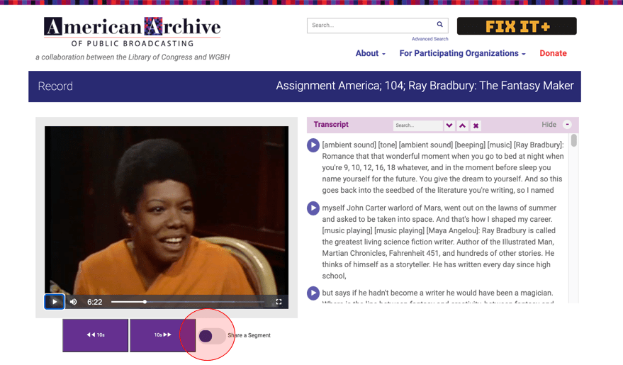 The American Archive of Public Broadcasting (AAPB) provides online access to more than 50,000 public radio and television programs and original materials, spanning 70+ years of history recorded by more than 120 contributing organizations. The new ‘Share’ feature on the AAPB website now makes it easy to share and embed items from the archive at specific timecodes.