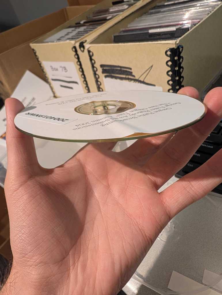 Out of 36 discs we found with paper labels, 28 either failed to transfer or encountered significant transfer errors (that’s a staggering 77%). Some had labels which were glued on—over time, that glue dried and caused the label to lift away from the disc. We weren’t able to transfer these discs for fear of what would happen when inserted into our disc drive without fully removing the label. Others spent hours transferring just to inevitably fail in the drive—those that succeeded occasionally produced incomprehensibly distorted audio. Although these discs were only a small population within the nearly 900 we digitized this semester, knowing that these discs contain stories and diverse teachings from an exhaustive list of inspiring radio programs makes it hard to let go when they fail. The initial inklings of disappointment, and admittedly frustration, were not easy to brush off. My colleague has been creating an alternative workflow to re-transfer these discs and copy them onto new CDs, so there is hope for their preservation, but the issue has stuck with me. I am certain that insight can be taken away from these discs in the event of their corruption, and perhaps this provides new ways of listening to the information these CDs offer in their degradation, not in their data.