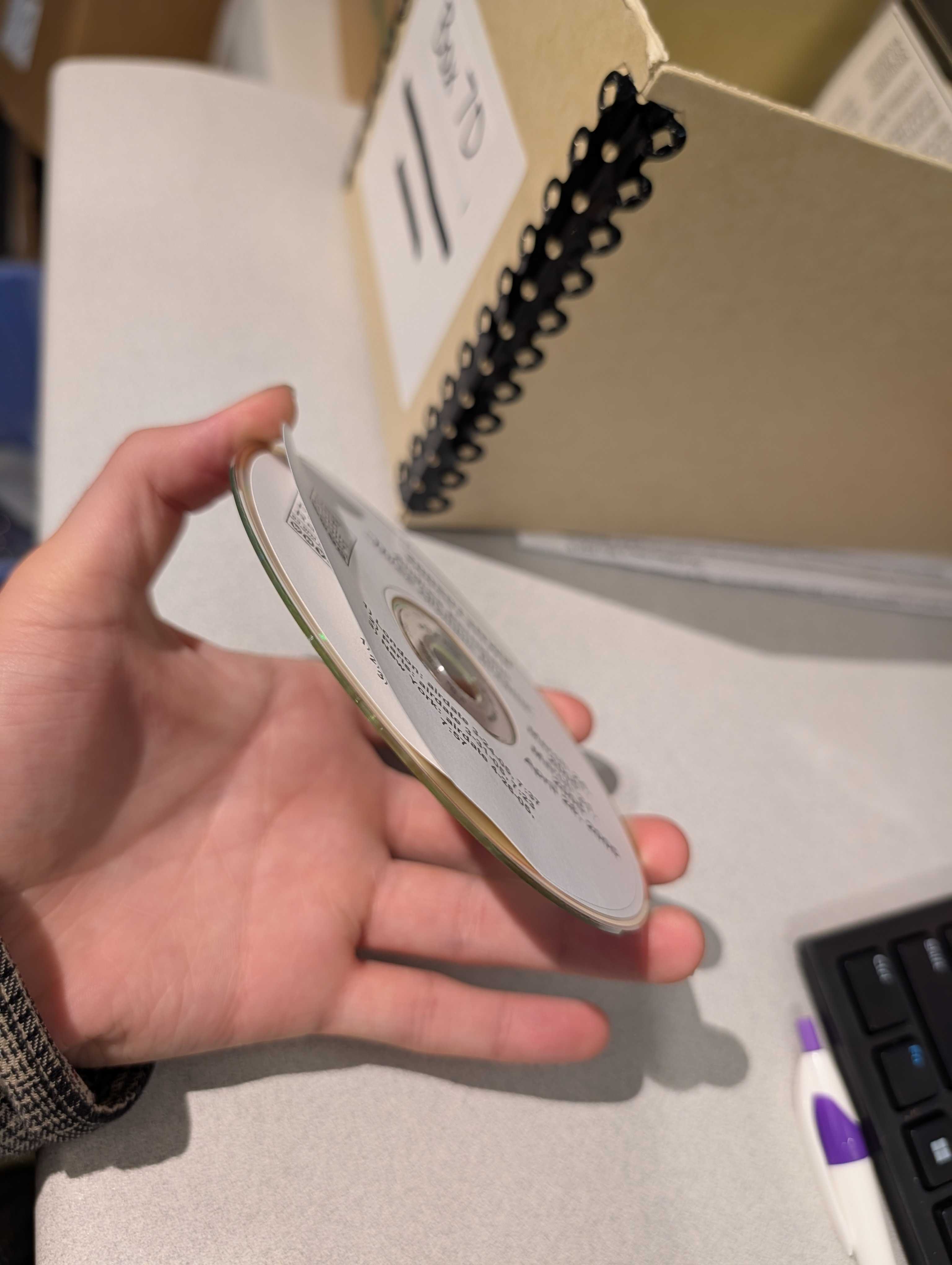 In our work, we have occasionally found discs that refuse to transfer, producing corrupted files with crackling roars of audible distortion. Many of these discs had a common denominator: paper disc labels. Although the exact nature of why these paper labels might cause problems to arise during transfer varies, and the information I reference here is often anecdotal—found on enthusiast forums or online archivist groups—there is a general consensus that poorly made labels may throw off the balance of a disc as it reads in a drive, glue has the potential to strip away data when it dries, causing labels to lift; and printed dyes may cause chemical degradation. Of course, proper storage can go a long way to keep things intact, but the layers of an optical disc are so tightly connected that interference with one may introduce disruptions to the other.